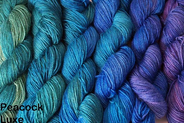 The original shawl was knitted in a colourway that went from pinks to mauves to blues. We were so happy with it that I knitted a second one in one of very first gradiance colourways, Peacock.