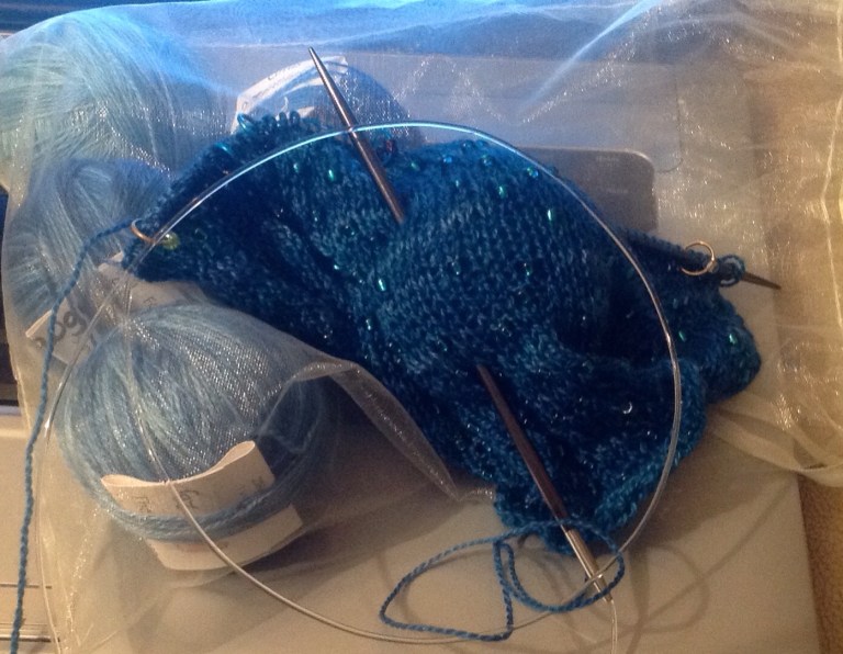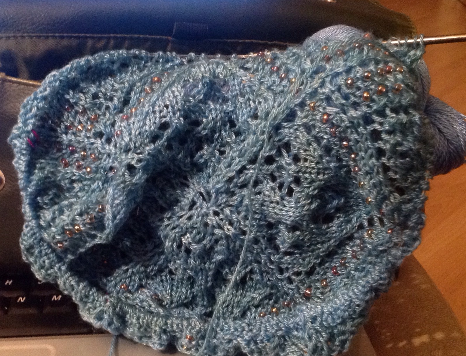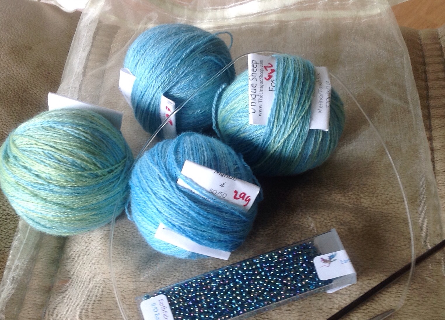 This one is Marion’s Sea Glass in Eos lace weight. With blue lined Aqua AB seed beads.
