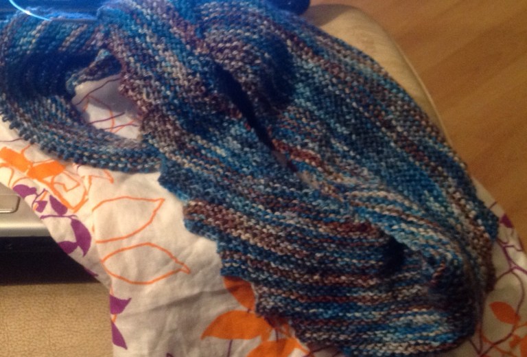 It is a hitchhiker scarf for my daughter – it is all garter st so it is easy to knit, even in the dark.