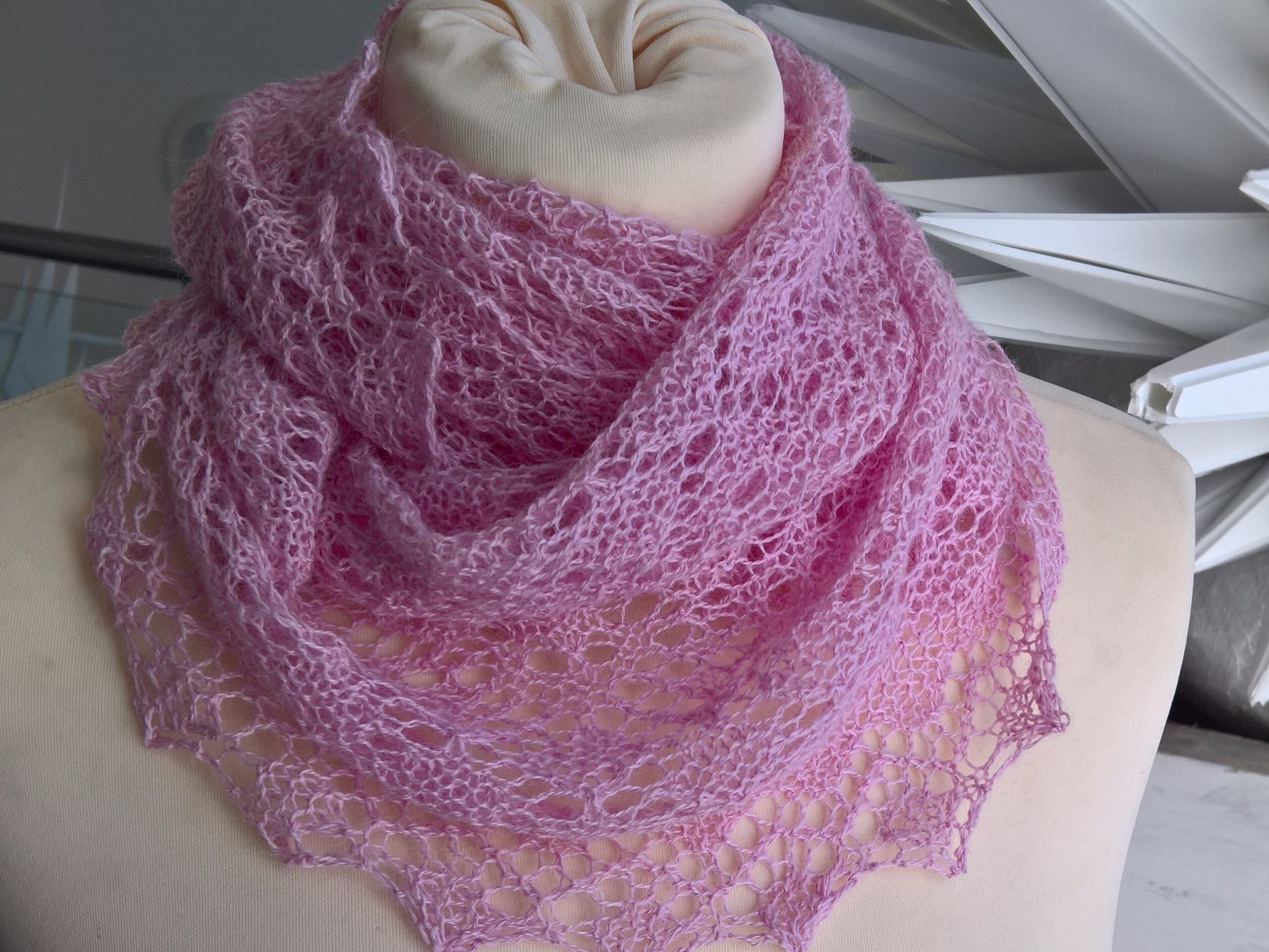 For those that are into the details, it is started with a provisional cast on, worked in the round and then a knitted on border is added at the top and the bottom. Because it is knitted on a garter st base it is completely reversible and though it is whispy looking it is nowhere near as complicated as it looks, because all the stitch patterns have rest rows, giving much more bang for your buck knitting wise ;-). It takes just one ball of yarn and is knitted on a US#3 ( 3.25mm) circular needle.