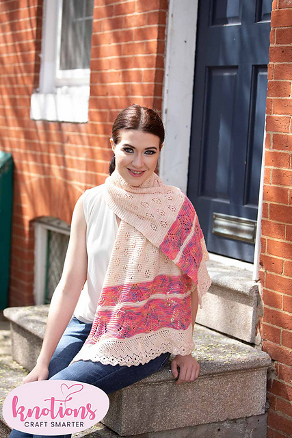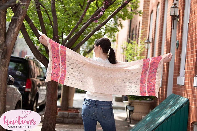 The shawl is knitted in sections. A sideways knitted border, then the paisley section with a central section of rosebud lace. A second border section is then grafted or attached with a three needles bind off at the other end.