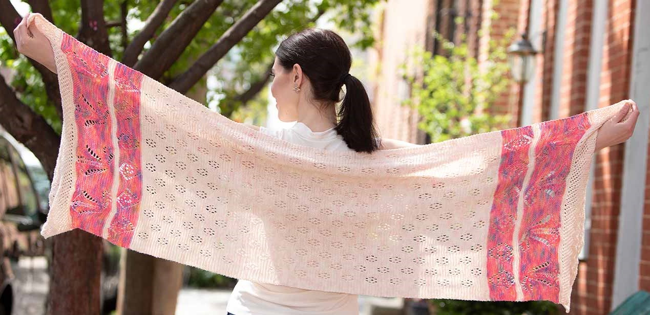 The shawl is knitted in sections. A sideways knitted border, then the paisley section with a central section of rosebud lace. A second border section is then grafted or attached with a three needles bind off at the other end.